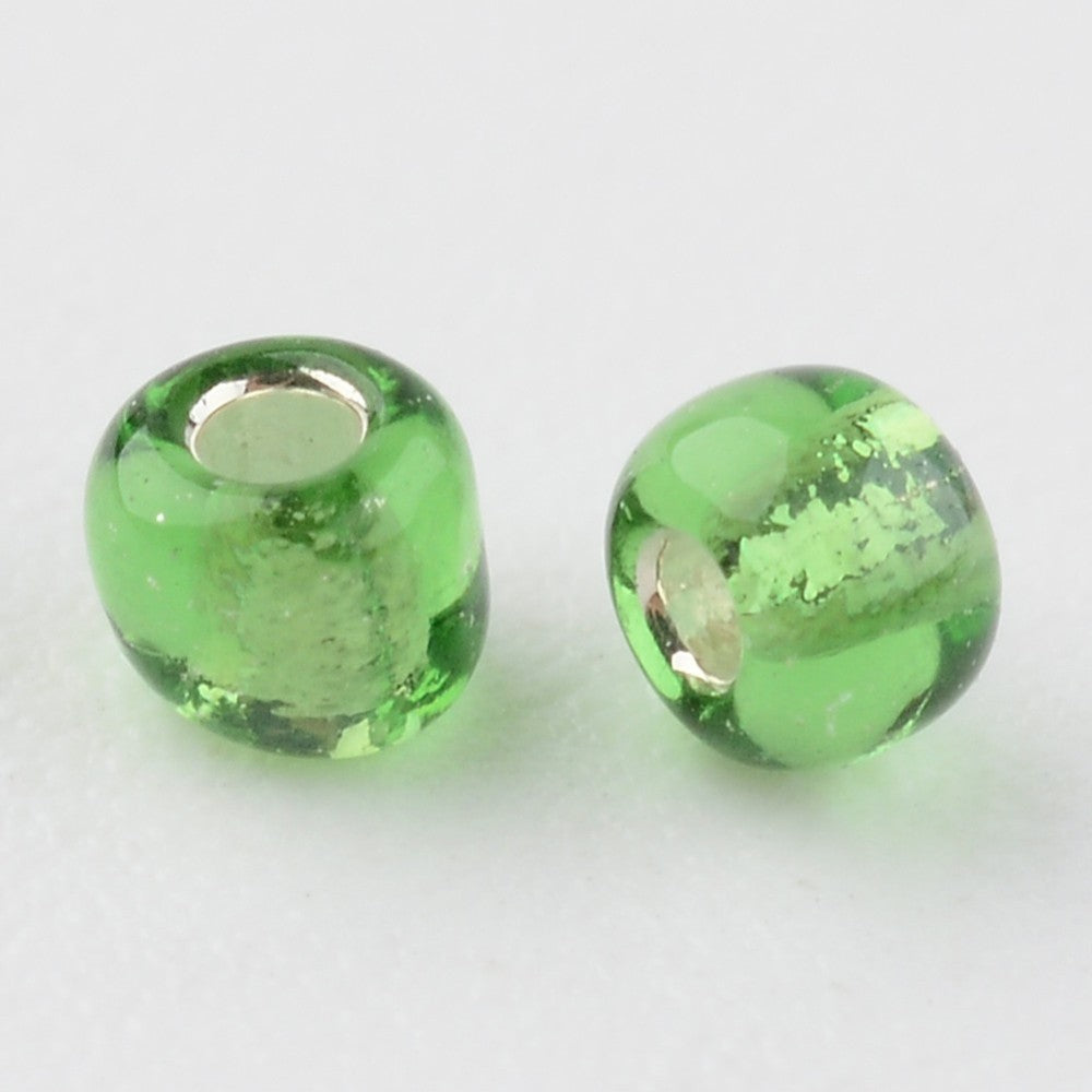 חרוזי זכוכית עגולים 12/0 עם ליבה בציפוי כסף בגוון ירוק ליים רענן. מתאימים לשרשראות, צמידים, רקמות חריזה ופרויקטי DIY צבעוניים עם נגיעה יוקרתית של ברק פנימי.