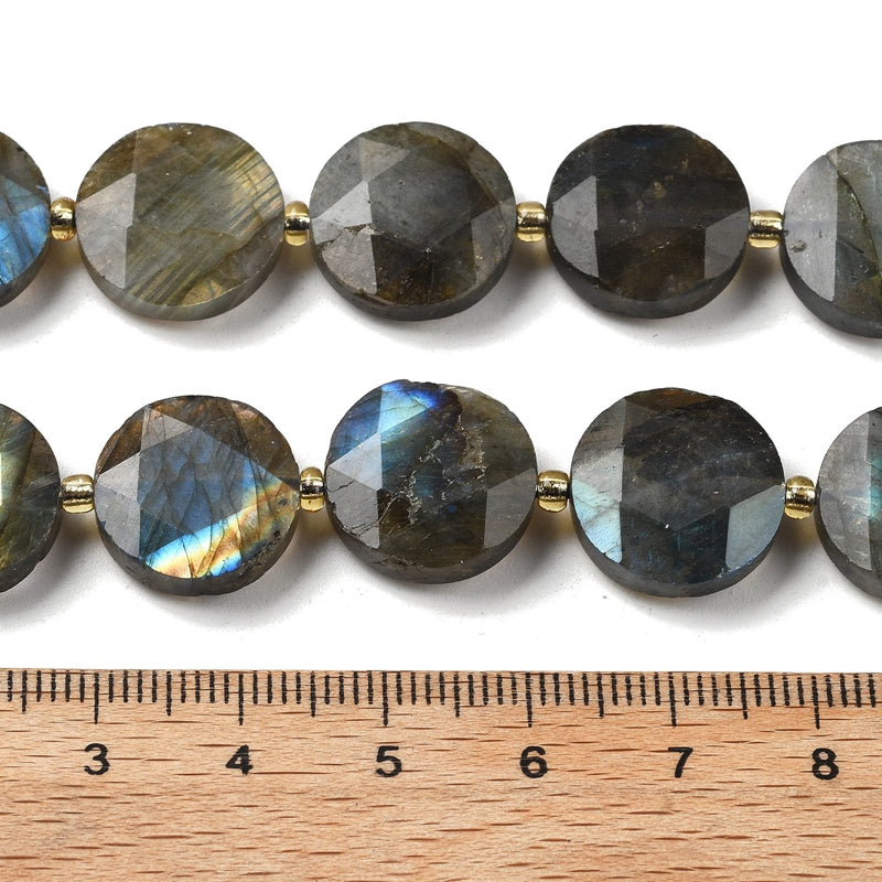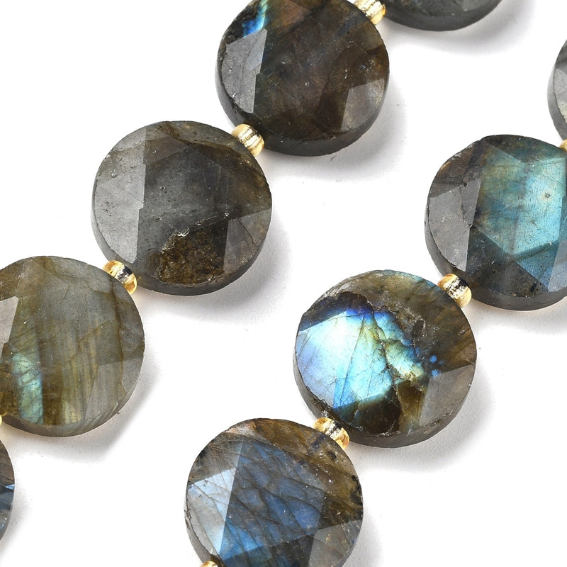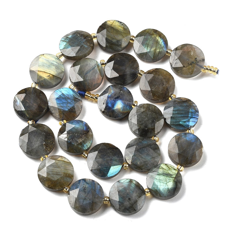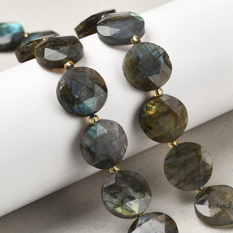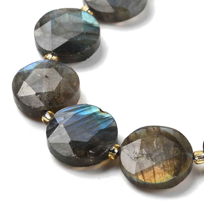 חרוז אבן לברדורייט טבעית בעיצוב גיאומטרי מרהיב. החרוזים מלוטשים לצורה עגולה ושטוחה (Flat Round) עם חיתוך משושה פסטים (Faceted Hexagonal) על פני השטח, המדגיש את משחקי הצבעים המהפנטים של האבן (הלברדורסנס) בגווני כחול, ירוק וזהב. הטור מגיע שזור עם חרוזי ונציה (Seed Beads) קטנים המפרידים בין האבנים, מה שמעניק לטור מראה מוכן לעבודה ויוצר עיצוב מתוחכם ובעל נוכחות עבור שרשראות אמירה (Statement) או צמידים ייחודיים.