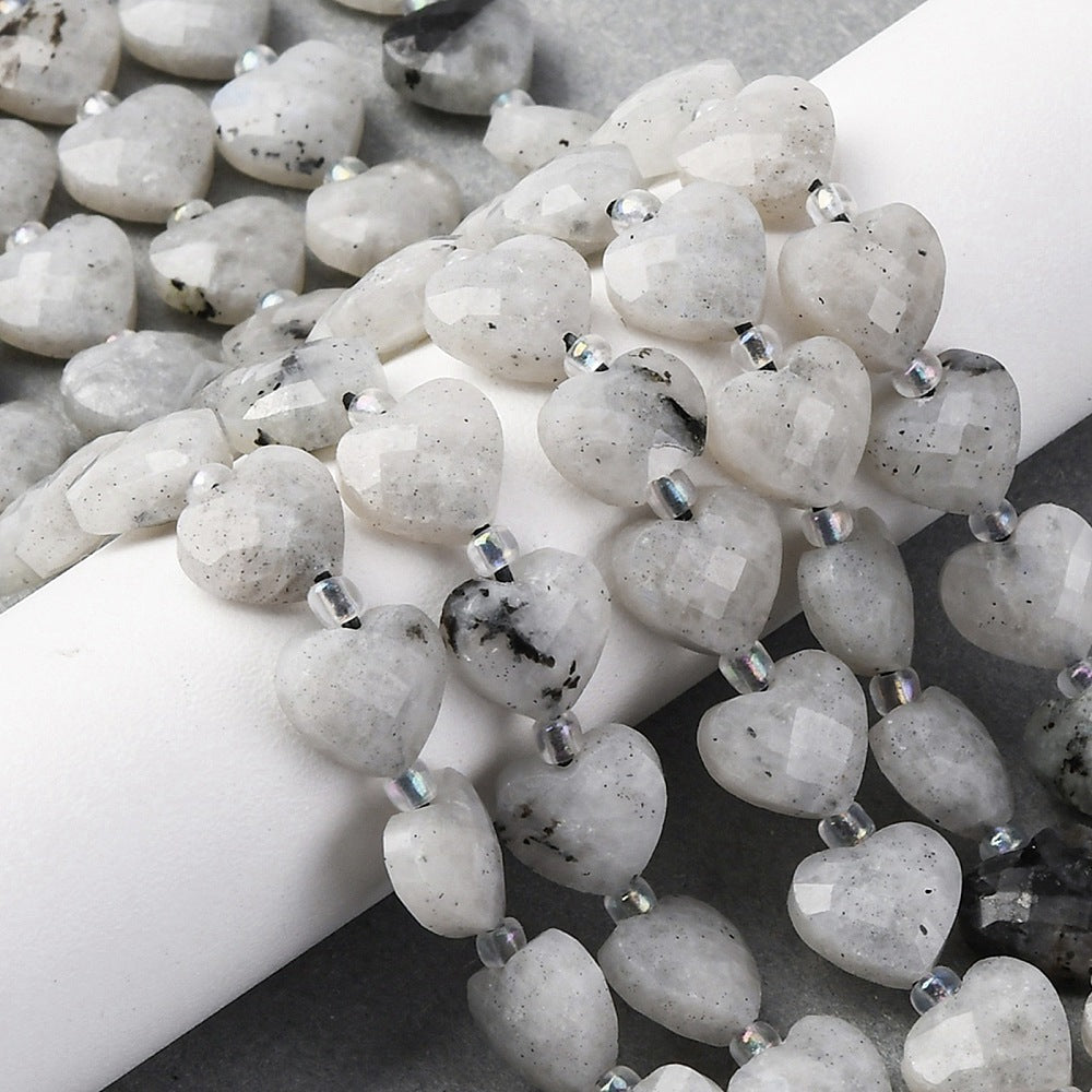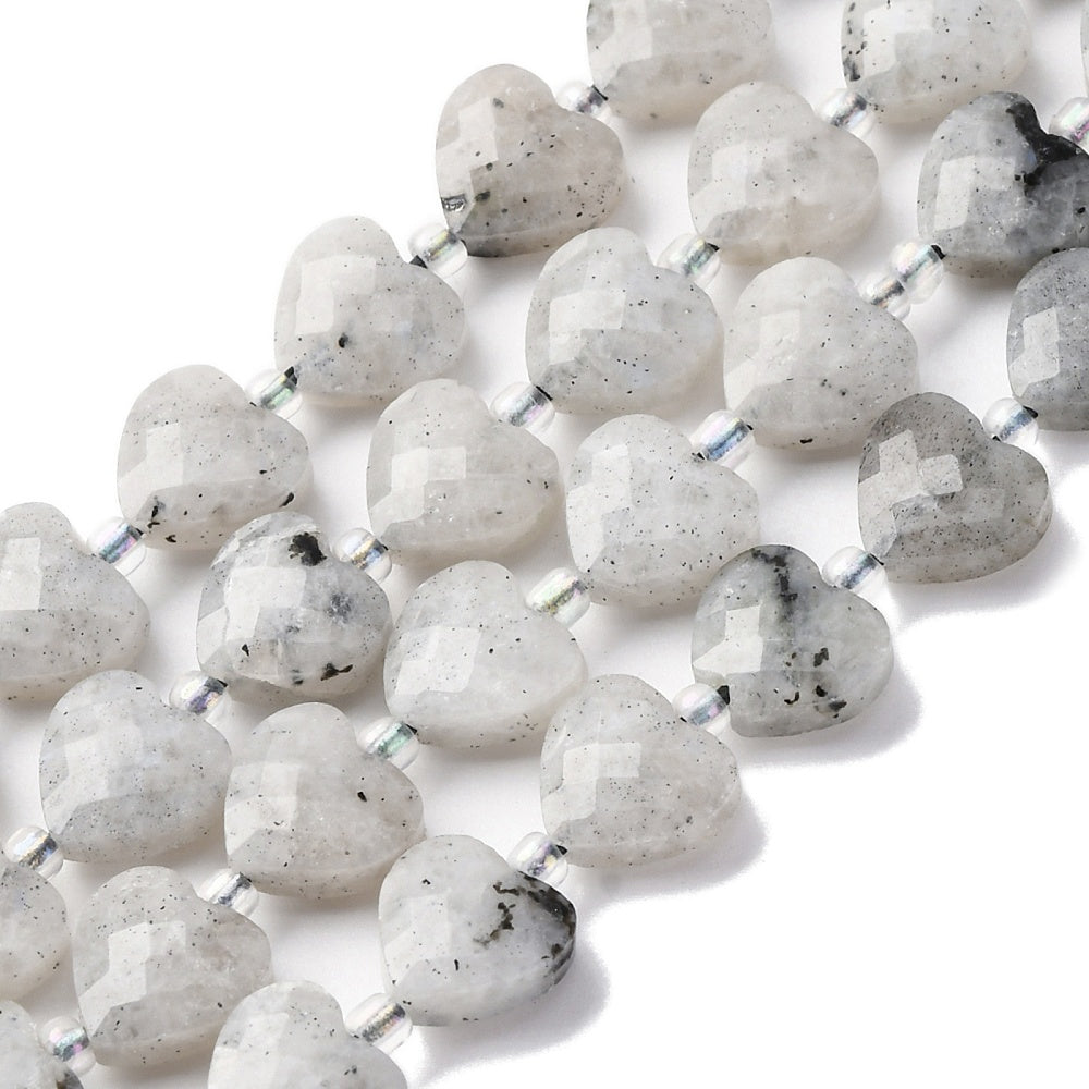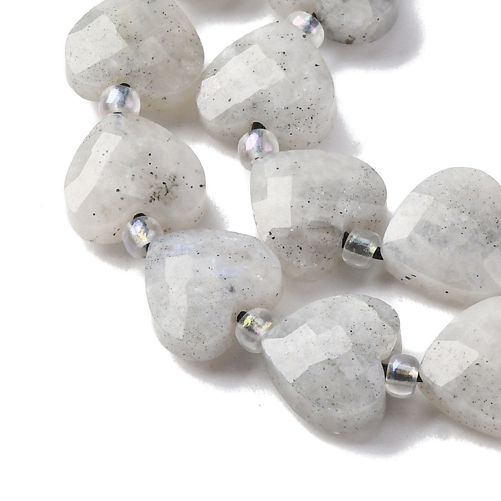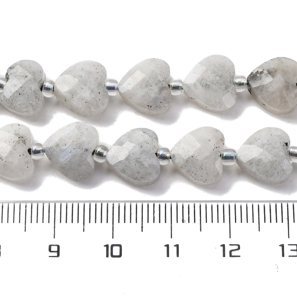 טור חרוזי אבן לברדורייט טבעית ומרהיבה, המלוטשים לצורת לב רומנטית עם חיתוך פסטים (Faceted) המעצים את אפקט הברק והנצנוץ. הלברדורייט ידועה במשחקי האור המיסטיים שלה (Labradorescence) המשתקפים בגווני כחול, ירוק וזהב על רקע האבן האפרפר. הטור מגיע שזור עם חרוזי ונציה (Seed Beads) עדינים המפרידים בין הלבבות, מה שהופך אותו לבסיס מושלם לצמידים רומנטיים, תליונים או שרשראות בעלות מראה קסום וייחודי.