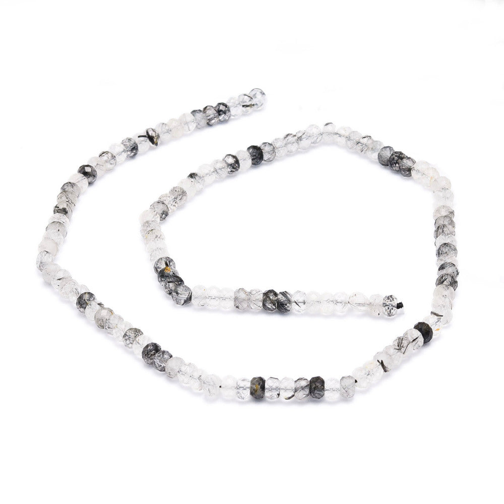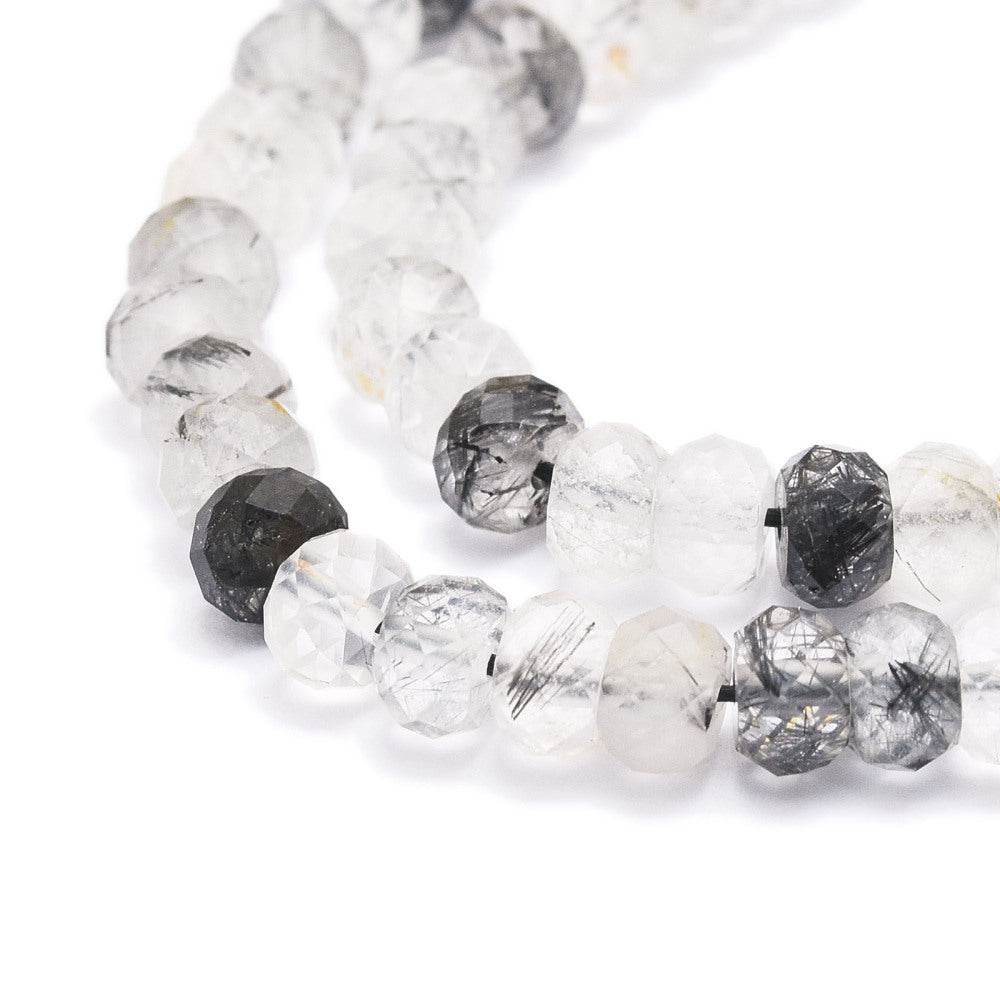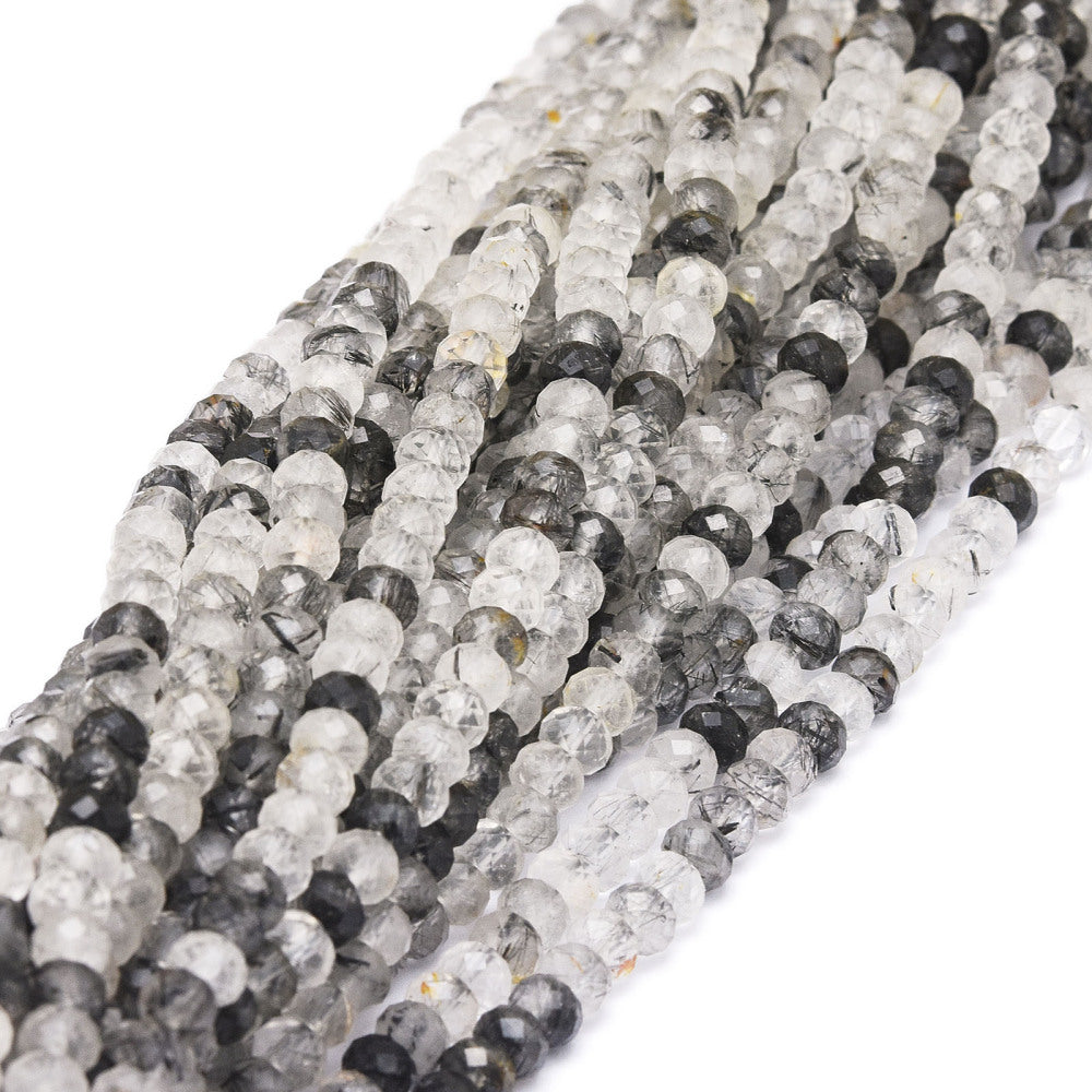 טור חרוזי קוורץ רוטיל שחור טבעי ומרהיב. האבן מתאפיינת בבסיס קוורץ שקוף או חצי-שקוף השזור ב"מחטים" או בגידים דקיקים של מינרל הרוטיל בצבע שחור, מה שמעניק לכל חרוז דוגמה גרפית ייחודית במינה. ליטוש הפסטים בצורת רונדל מוסיף נצנוץ יוקרתי ומדגיש את המראה המודרני והאמנותי של האבן. חרוזים אלו מושלמים ליצירת תכשיטים מתוחכמים, שרשראות עדינות וצמידים בעלי אמירה אישית וטבעית.